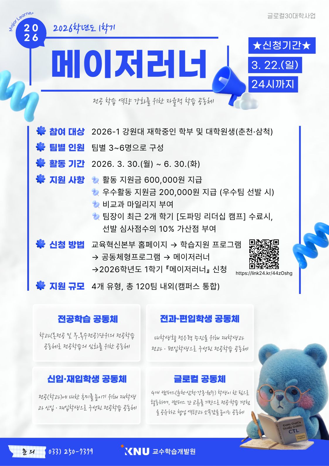 5. 지원규모: 4개 유형, 총 120팀 내외(전공학습, 신입·재입학, 전과·편입학, 글로컬 공동체)